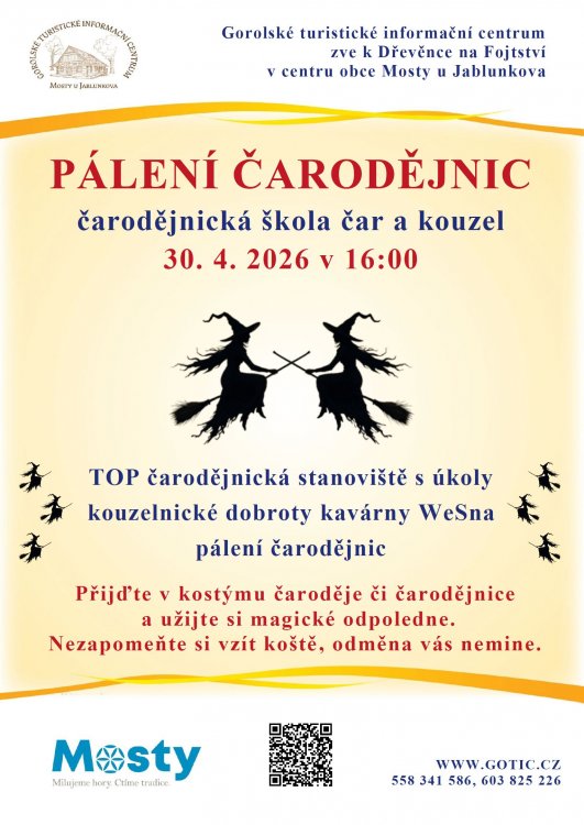 Srdečně vás zveme na tradiční pálení čarodějnic s podtitulem Čarodějnická škola čar a kouzel, které se uskuteční ve čtvrtek 30. 4. od 16:00 v centru obce u Dřevěnky na Fojtství. 🧹🧙♀️🧙♂️🕷️